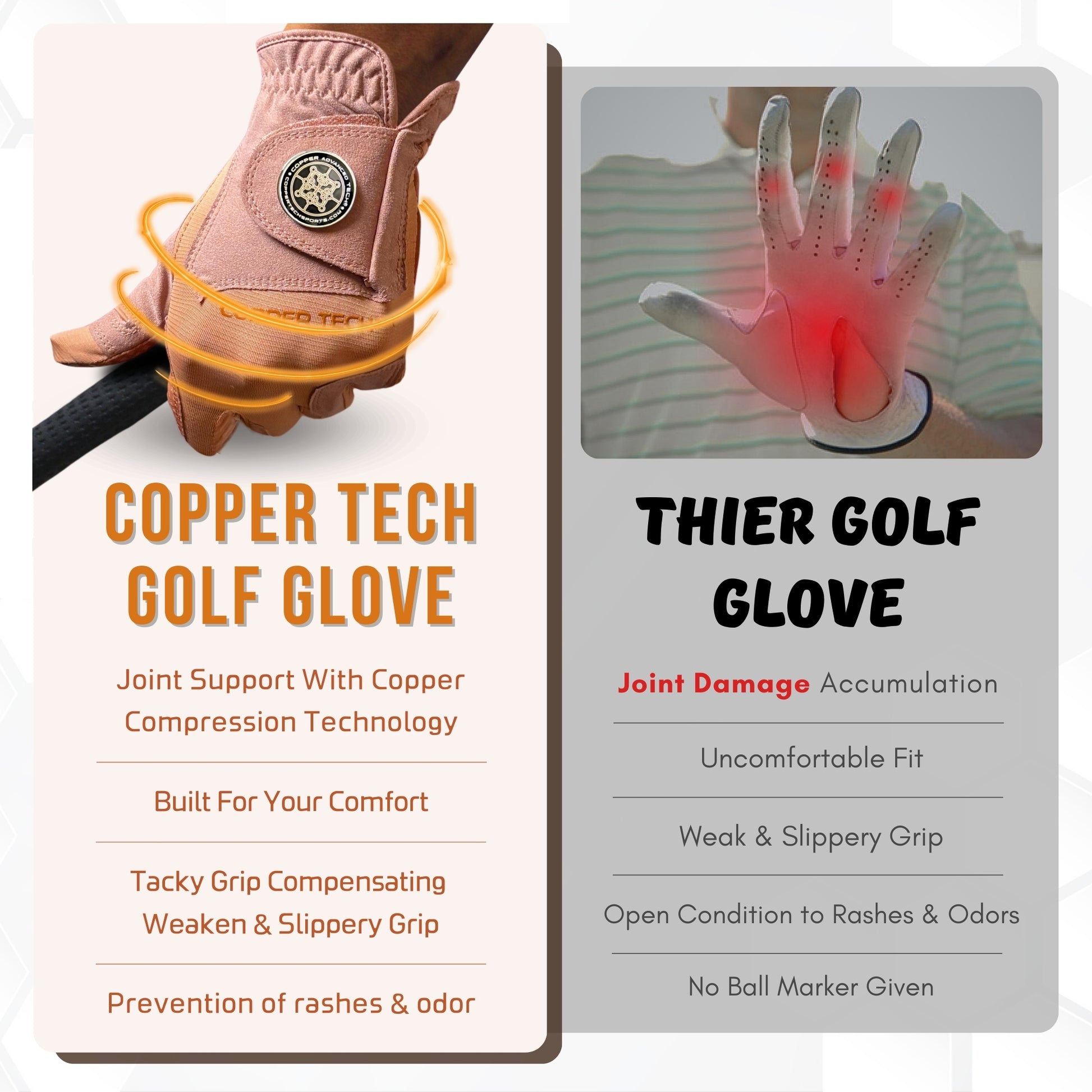 - [Copper Infused Compression Tech] - With our advanced copper compression technology, copper tech golf gloves men provide essential support to help reduce swelling, boost blood flow, and alleviate joint and muscle stiffness & soreness while golfing.