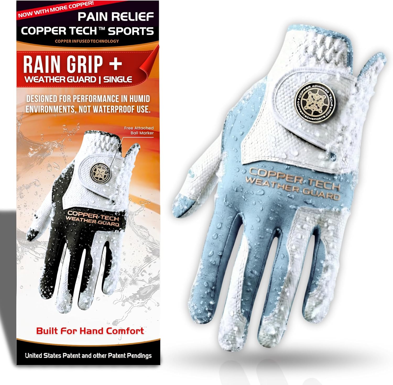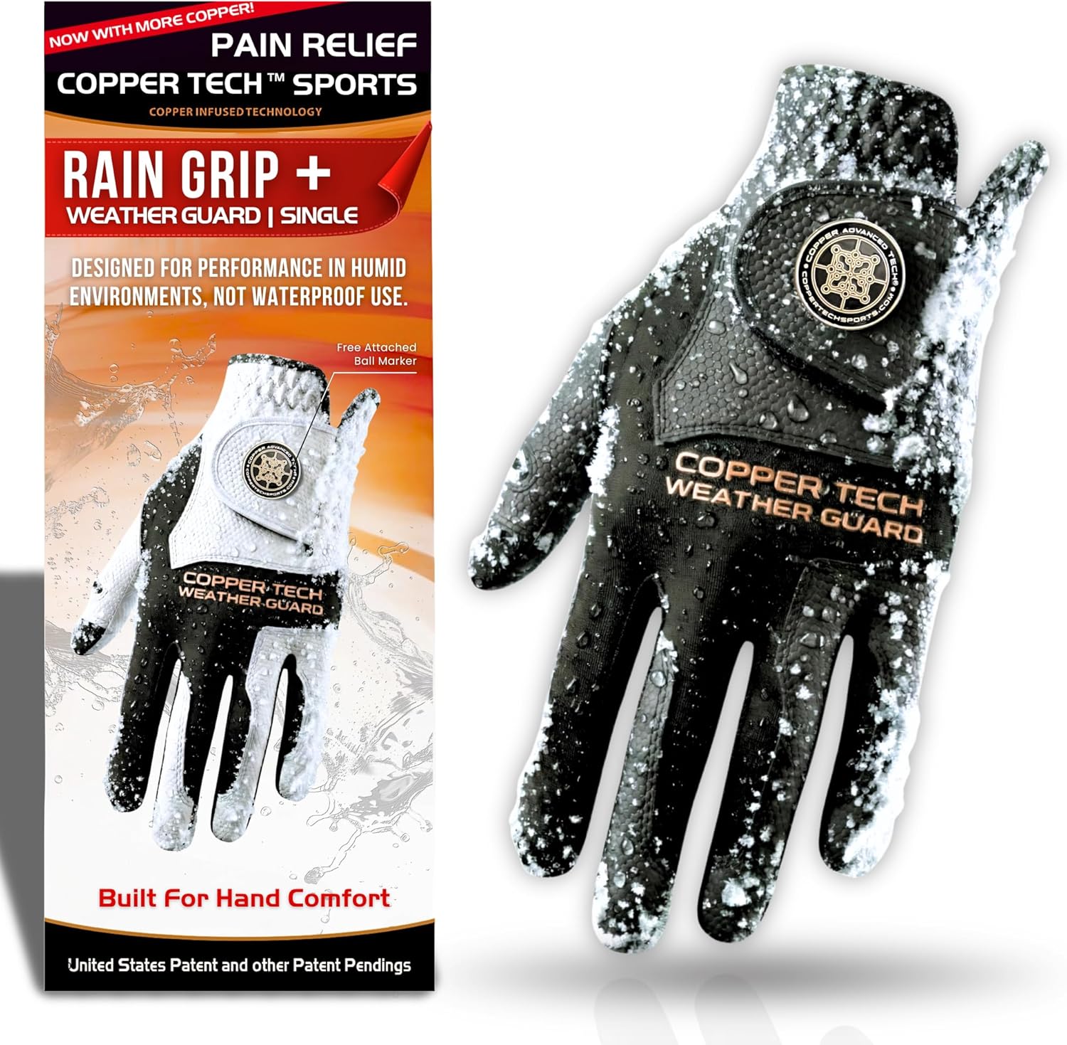 Conquer the elements and maintain your competitive edge with Copper Tech’s latest innovation in golf rain gloves for men. We understand that serious golfers don't let bad weather ruin a good round, so we engineered a glove that doesn't just tolerate water—it thrives in it. Unlike standard golf rain gloves that can feel bulky and lose effectiveness when saturated, our revolutionary model features a proprietary Hydro-Activated Grip on the palm. This advanced performance material is designed to increase traction when exposed to moisture, meaning the wetter it gets, the tighter it grips. This ensures you have absolute confidence in your swing during downpours or high humidity, which is essential for rain gloves golf scenarios where a slipping club can cost you the game. What truly sets this apart from other rain golf gloves men usually settle for is our signature Copper Tech wellness technology. Since cold, damp weather often aggravates joint pain and stiffness, we have infused high-performance copper ions directly into the fabric to provide therapeutic compression. This helps improve circulation, keeps stiff hands warmer in chilly rain, and soothes aches associated with arthritis. With Copper Tech, you aren't just buying a rain glove; you get superior water-enhanced traction, pain relief, and a premium flexible fit that acts as your secret weapon against the toughest conditions, rain or shine.